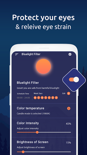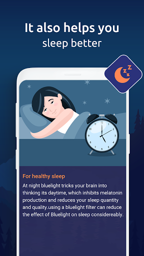 Prolonged phone usage at night could lead to dry eyes and eye strain. The Blue Light Filter app protects your eyes from harmful Blue Light and provides a soothing effect. This app adjusts your screen temperature to make your screen warmer(More Orange). Your eyes will thank you for it.