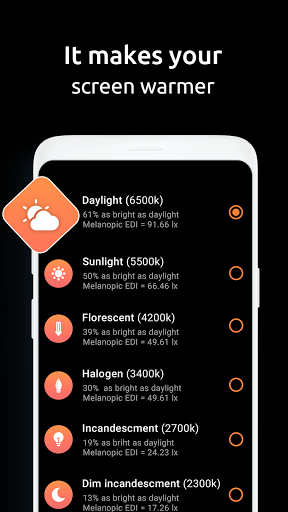 This app lets you select the intensity of the blue light filter by manually selecting your preferred colour temperature.