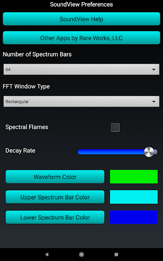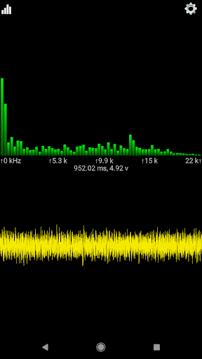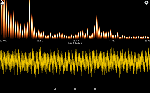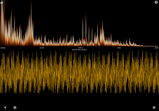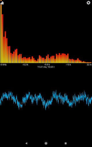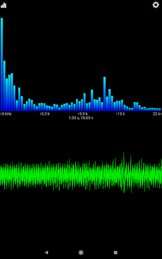 Sound View is an Audio Spectrum Analyzer App. It analyzes sound from the built in microphone, or from an attached external microphone, and displays both the input signal, and the results of the spectrum analysis. The input signal is displayed in the lower view as a waveform and the spectrum is displayed in the upper view as bars indicating the strength of that frequency within the input signal.