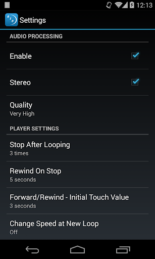 You can repeat any section of the music at full speed, slow it down or even speed it up by changing the speed between 25% (1/4 of original speed) and 200% (double speed) without changing the pitch!