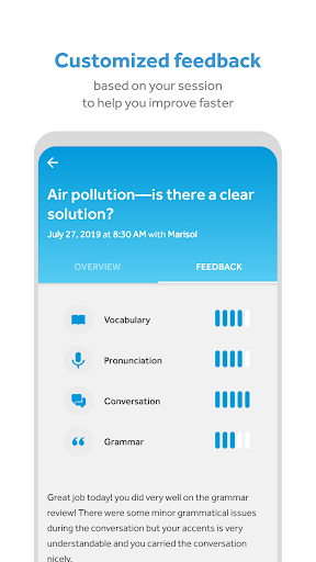 • After each session, our tutors provide you with personalized feedback specific to your progress in English mastery. You will also receive a review list of vocabulary words and phrases to help create a complete learning experience