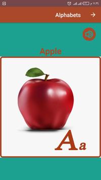 alphabet, numbers, colors, shapes, Vegetables, animals, days , months, fruits, vehicles and much more for kids.This app helps kids to learn new things easily like A for apple, numbers identification and pronunciation, identify shapes etc..