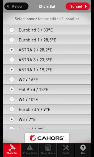 This satellite finder dish pointer app shows you direction in which you are going align your satellite dish. Based on your location the following satellites are available: