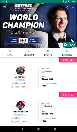 Displays and updates Live matches Scores. Data is provided by Snooker.org. You can turn on Notifications for these Matches. Top snooker players i.e. Ronnie O’sullivan, Mark Selby, John Higgins, Judd Trump, Shaun Murphy, Ding Jinhui, TepChayya Un-nooh, when get live in action, users will receive notifications and alerts. You can pin live matches and see the updates on frames in notification area without opening the app.