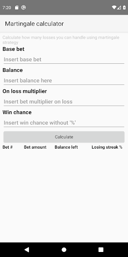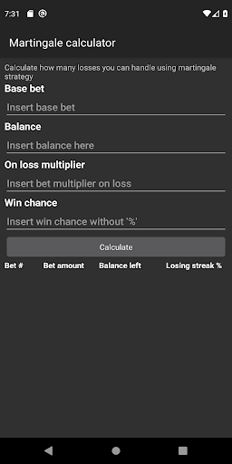 Martingale calculator helps you to calculate what is the probability of losing all of your funds using this strategy, also calculating losing streak probabilty per bet and showing how much balance left after every single bet.