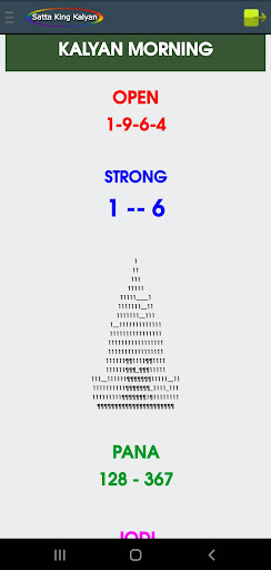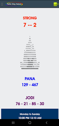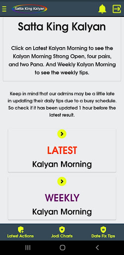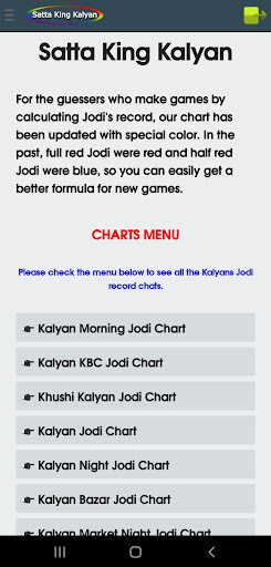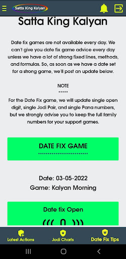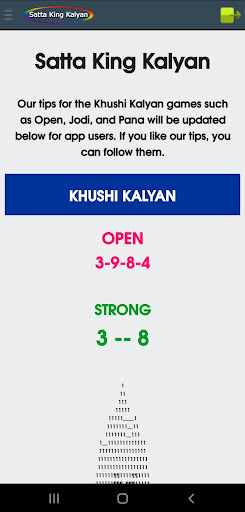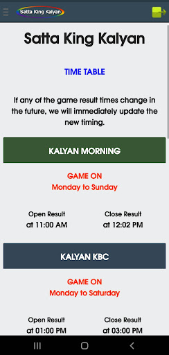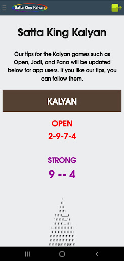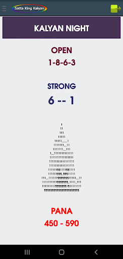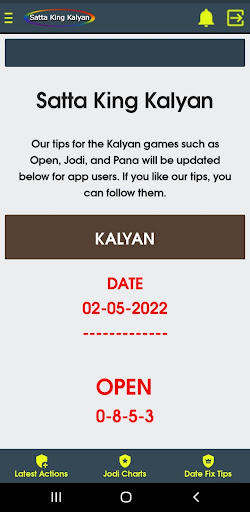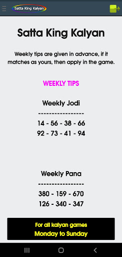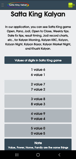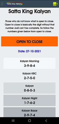 Sa aming application, maaari mong makita ang satta king game bukas, pana, jodi, bukas upang isara, lingguhang mga tip.Petsa ng pag-aayos ng mga tip, tiyempo ng resulta, jodi record chart, atbp, para sa Kalyan umaga, Kalyan KBC, Kalyan, Kalyan gabi, Kalyan Bazar, Kalyan Market Night, at Khushi Kalyan.br> ===============