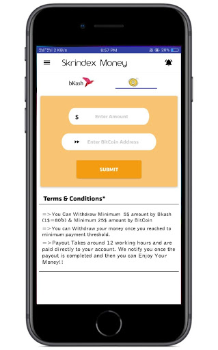 This is Skrindex Money. You can earn money though online everyday. This is most trusted and paying app. Once u earn payout level you'll get your money within 24 working hour after redeem. For Bangladesh you can redeem view bkash and for international you can redeem view BTC(Bitcoin).If you violate app rules your account wil suspend for ever. Earn up-to 5$ per day. Thanks for stay with us. Keep it up and make money.