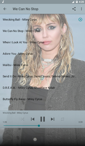 Miley Cyrus Best of Music is a fun application to help you listen to offline music without the Internet. In addition, Miley Cyrus Best of Music is also a collection of Miley Cyrus music albums. The high quality MP3 songs performed by Miley Cyrus are selected by us and put into Miley Cyrus Best of Music application. This is the best and most complete Offline music app for Miley Cyrus's lifetime albums we've compiled.