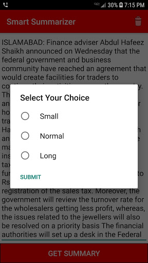 Don't read large text or news articles, with smart summarizer you can get instant summaries of articles, a short summary of a document.