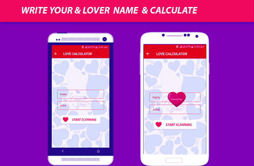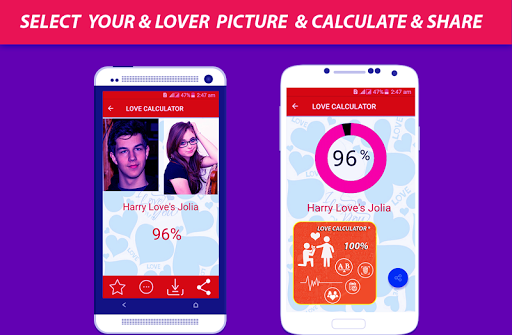 this app is fun app basically use to calculate the love between you and your near and dear ones this app calculate love in a multiple ways that is designed by us to entertain the lovers for example open the app and type the name of your and your lover like girlfriend or boyfriend