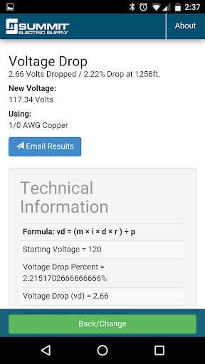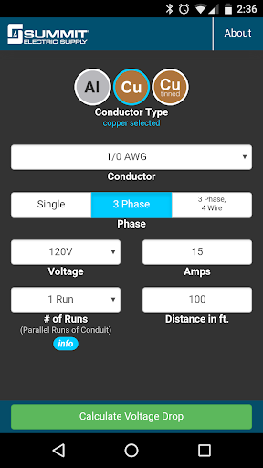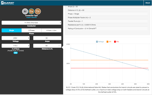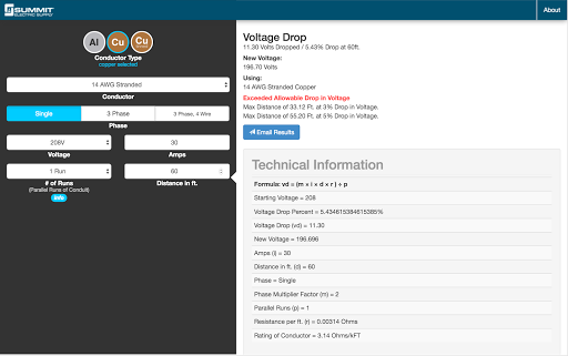 Summit's Voltage Drop Calculator allows you to quickly calculate and share voltage drop for a selected conductor size and type based on the 2014 NEC. This simple and easy-to-use calculator delivers professional results for any size job or project. Simply select your conductor then enter your voltage, amperage, phase, distance, and number of runs to determine the new voltage and percentage dropped. You’ll get instant results for each calculation that includes the formula used as well as detailed technical information.