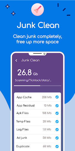 It helps to clean System Cache, App Cache, AD Junk, Memory Junk, and Residual Files, which are often left by uninstalled apps to free up Android phone space.