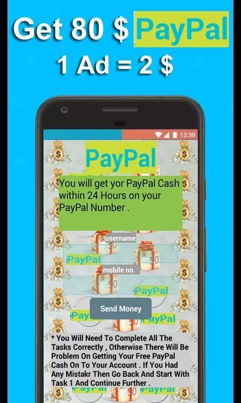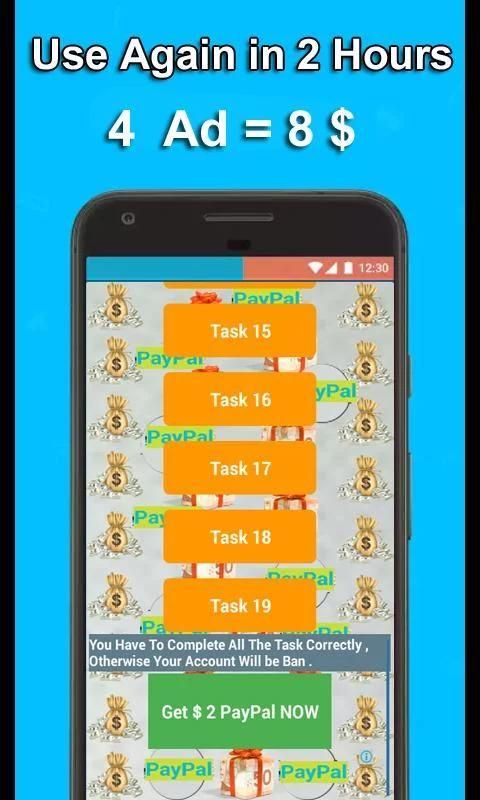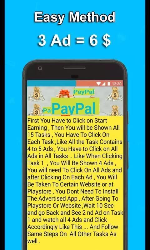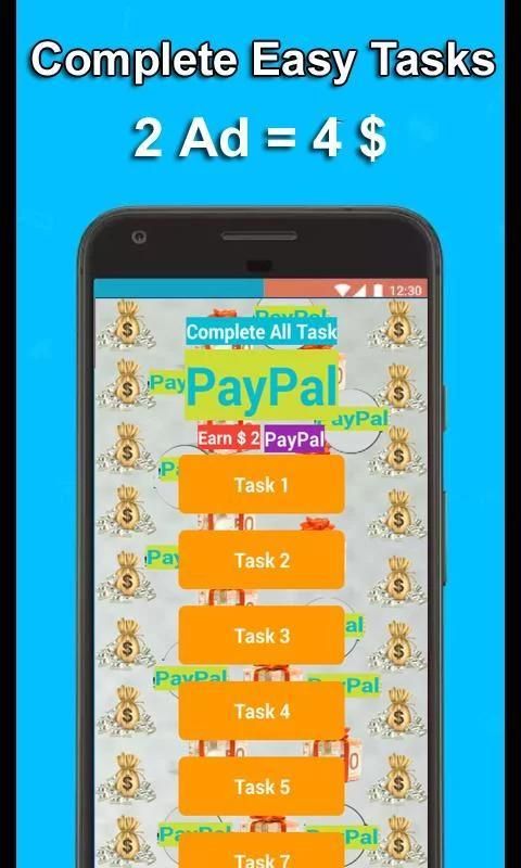The First App that gives you Free PayPal Cash , Recharges for everytime just you click on showing Ad's .... It Has 14 Tasks Containing 4 to 5 Advertisment in Each Task , You Need to just click on all Ad's and wait 10 seconds , You dont need to install Adverstiment Apps , You just need to wait 10 -15 Sec. ,then return back and do same thing again and again .