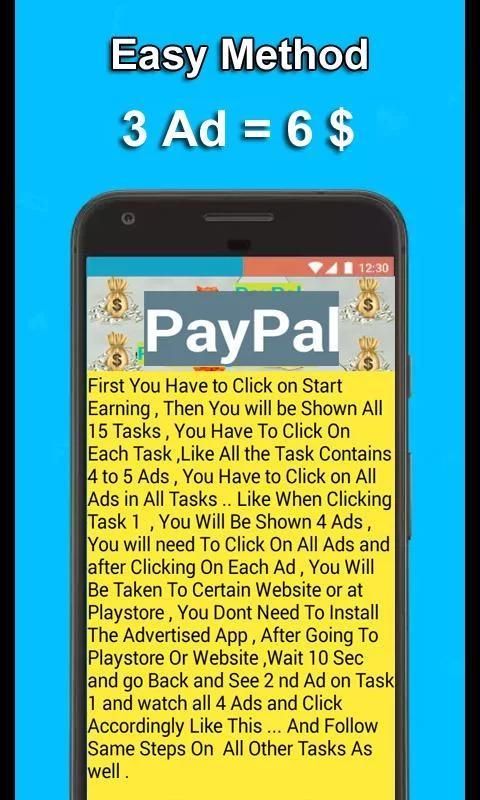 The First App that gives you Free PayPal Cash , Recharges for everytime just you click on showing Ad's .... It Has 14 Tasks Containing 4 to 5 Advertisment in Each Task , You Need to just click on all Ad's and wait 10 seconds , You dont need to install Adverstiment Apps , You just need to wait 10 -15 Sec. ,then return back and do same thing again and again .