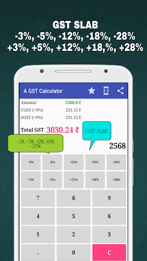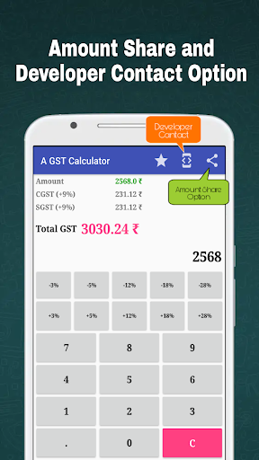 • GST Calculator App also lets you get net price of your product with GST – feature buttons of -3%,-5%,-12%,-18%,-28% and +3%, + 5%, +12%, +18%, +28% with just one single click and you can also check with GST and without GST also.