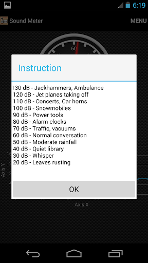 Sound Meter is professional sound meter for your Android. Sound Meter is also known as sound level meter, decibel meter (dB meter), noise meter, sound pressure level meter (SPL meter). Sound Meter uses your Android's microphone to measure levels of noise or sound pressure levels and displays measured data in dB (decibels) with reference to generally known noise (provided by American Academy of Audiology) or displays the noise data on easy to read graph for the last 30 seconds of app use.