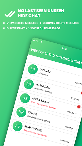 Now Hide Last Seen with ‘No Last Seen & View Deleted Messages – Unseen App’ on WhatsApp. Read Message with No Blue Tick without showing anyone that you are reading delete message with this Unseen Free App. If someone send message on WhatsApp and deletes it you can still read message in this ‘No Last Seen View Deleted Messages – Unseen App’ for free. Hide your WhatsApp online Status and blue ticks with recover all the messages in this free unseen app. Read message with this Unseen Messenger on your mobile phone. You can avoid Blue Ticks and read unseen WhatsApp messages without knowing your friends. No Double Blue Ticks and No Last Seen, You can read your friends messages and chat anonymously and also messages they have deleted. Will also try to save any media attached to the message and if the sender deletes it, you will receive a notification. No last seen no online whatsapp
