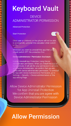 By Start Protection, You will be asked to activate Device Administrator Permission for this app. Timer Lock App uses device administrator permission for prevention of accidentally Uninstallation and nothing else. To Uninstall this app you need to deactivate device administrator. You can easily deactivate by Turning off Start Protection from the app or you can go to Settings->Security->Device Administrators from your phone anytime.