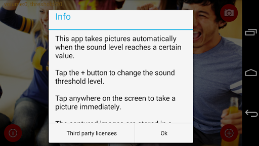 The app monitors the noise level and captures images automatically when a certain noise level is reached, providing effortlessly the best photo capturing experience.