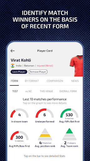 Player Card : Find your match winners by viewing detailed information on a player’s recent form relative to teammates and the opposition, all in the context of Fantasy Sports