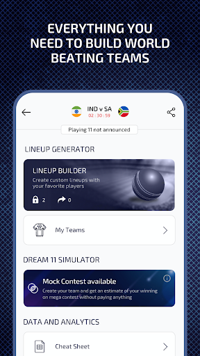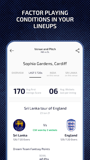 Build unique and unbeatable teams by identifying successful combinations by viewing detailed cricketing statistics and predictions on players, venues and recently completed matches.
