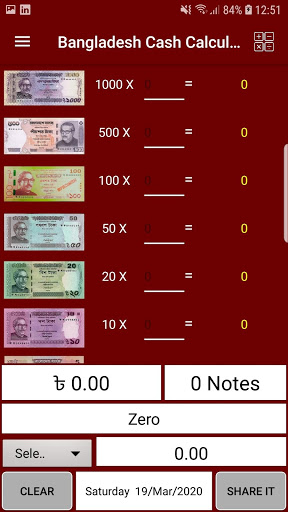 Only For Bangladeshi currency denominations, Bangladesh Cash Calculator and Counter, Save daily database. Total of all Notes in the digit.
