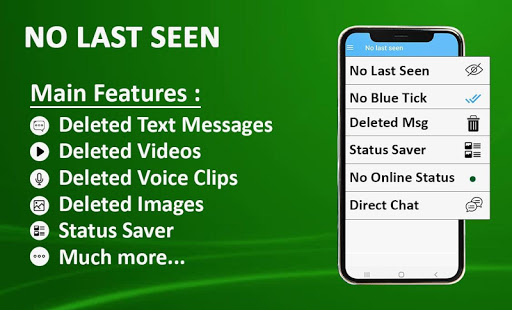 No Last Seen for Whats App is a simple app to read the whats-app messages without displaying blue tick and also we can read the message which are deleted by sender. This app does not show your status online and you can view messages without knowing them.