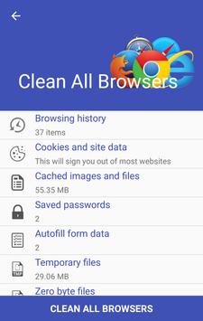 Browser Cleaner is an android system tool which can clean your browsing history, cookies and site data, cached images and files, saved passwords, autofill form data, temporary files, zero byte files, save your disk space ,make your phone's speed more faster.