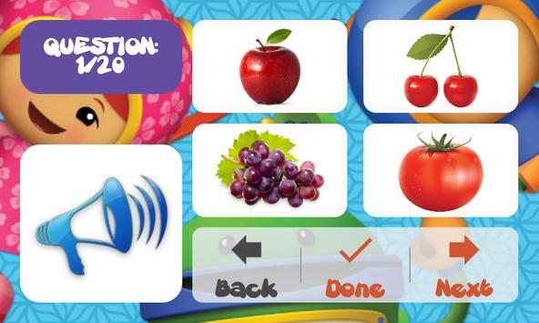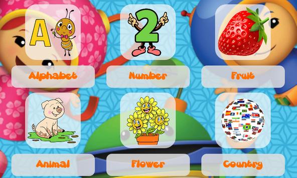 This game has 9 topics which are around kids real life: English alphabet, animals, fruits, color, careers, transports, home, food and number.