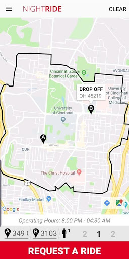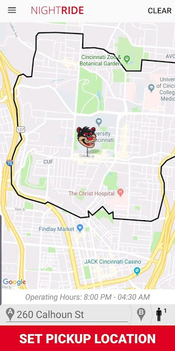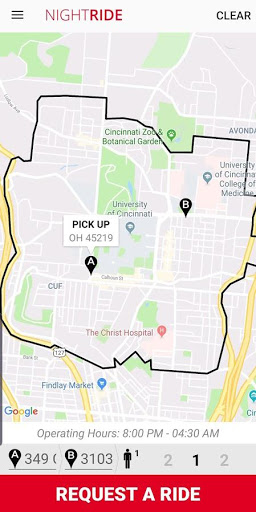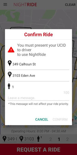 With the UC NightRide app a free nighttime ride is a tap away. Set your pickup and drop off location anywhere within a 1 mile radius of campus, tell us how many people are with you, and we'll pick you up. Stay safe, UC. Use NightRide.