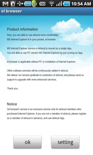 Now, you are able to use elcloud more comfortably.MS internet Explorer 8 in your pocket, el browser MS Internet Explorer service in elcloud is moved as a single App.You are able to use PC version MS Internet Explorer by just running an App.el browser is applicable without PC or installation of Internet Explorer.Other software services will be continuously added in elcloud.We deliver our sincere gratitude to customers of elcloud, and please send us support to upgrade with more enhanced services.Thank you.