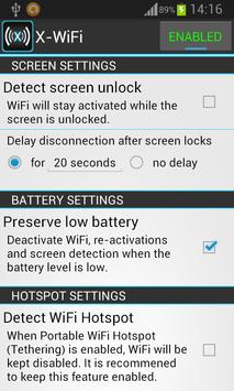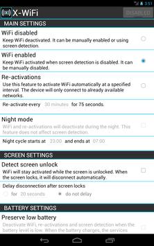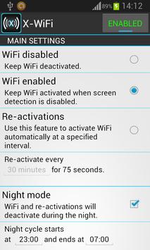 X-WiFi is an application suitable for tablets, smartphones and all devices that have WiFi. It has been developed specifically for WiFi devices to provide an intelligent and easy way to control the device's connectivity. The application helps the user to manage WiFi activations and deactivations based on his settings and saves battery, especially when the battery level is low. Feel free to send us your feedback and to report any bugs!