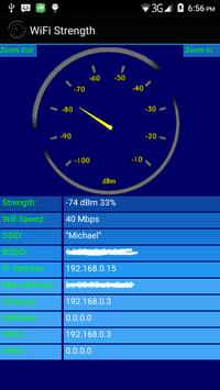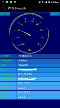 This app displays the current WiFi strength in dBm and percentage graphically using OpenGL. Additional information is displayed : 1- WiFi Speed 2- SSID 3- BSSID 4- IP Address 5- MAC Address 6- Gateway 7- NetMask 8- DNS1 and DNS2