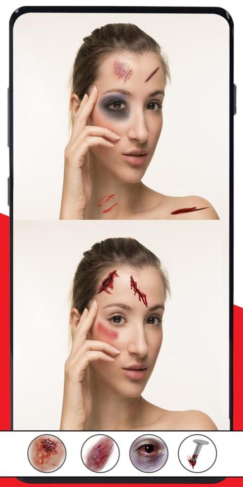 اضف الجروح على وجهك و جسمك وجعل مظهرك مخيفًا. هو تطبيق محرر صور يقدم لك مجموعة متنوعة من الاستيكرات المخيفة لإضافتها إلى صورك وإعطاء تحول افتراضي لوجهك وجسمك في الثانية.