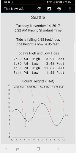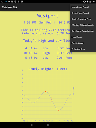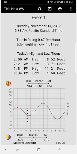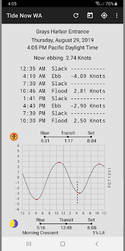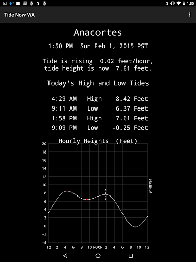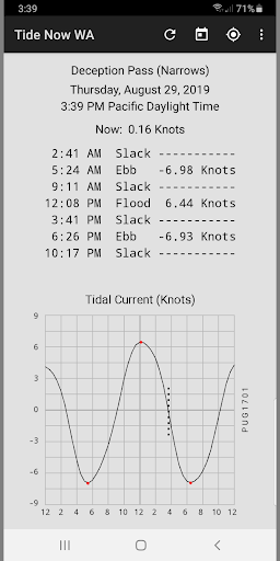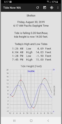 Tide Now WA is a tide and tidal current calculator for Washington State. Each station displays a graph, daily table, present levels status, and daylight/sun/moon timing. There are 138 tide locations and 18 tidal current locations. There are 14 nav charts to display station location.