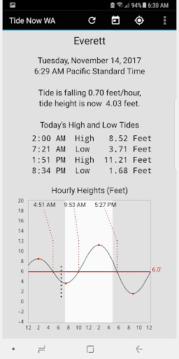 Mark Height - You can mark any given tide height on the graph. The height line is drawn, along with the times the tide crosses this line. Examples boat launching, clam digging, walking around obstacles such as bulkheads.