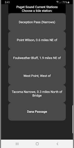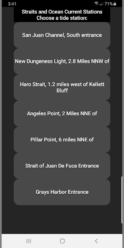 The tidal status presentation gives an immediate snapshot of the tide or current status, as well as a list of highs and lows. The display can be refreshed at any time to update this status. This app is designed for use while actively out and about along the waterfront.