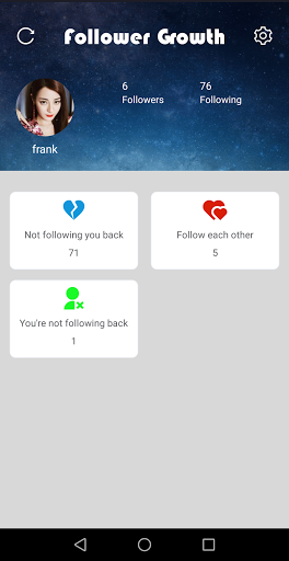 Open Unfollow Users Plus for instagram (Follower Growth), after you login with your instagram account, You will find three function in the main page. The first function is unfollowers, the count is the users count who not following you back. There is a unfollowers list will display in the unfollow page. You can click the "unfollow" button in the item row to unfollow the user.