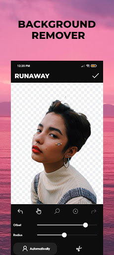 * Automatically background removal, the runaway aurora filter app provides the ability to remove the background from any photo automatically, thanks to our ia that can help you to automatically detect and remove the unwanted background.