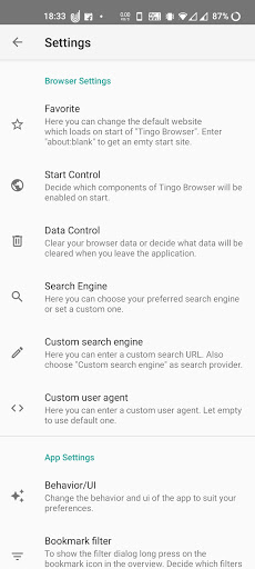 "Tingo Browser" is fully free/libre (as in freedom) Android app. The source code is public. The app also does not need any unnecessary permissions. It's a simple Android browser based on webview. The intention is to provide a simple and light weight but powerful browser with a nice looking user interface.