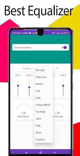 Bass Booster lets you adjust sound effect levels so that you get the best out of your Music or Audio play coming out of your phone. Virtualizer making media files produce quality sound in a Digital Surround Support!