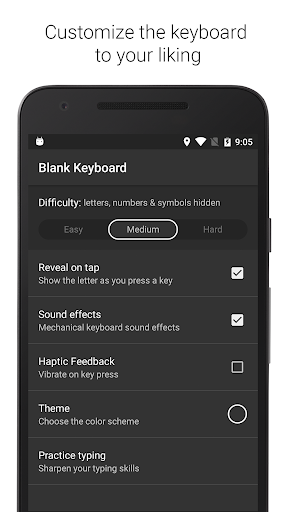 Inspired by physical keyboards that have no labels on their keys, Blank Keyboard strives to provide a similarly minimalistic & rewarding experience. Featuring sound effects that mimic that of a real mechanical keyboard, and fine control over the appearance and behavior of the app.