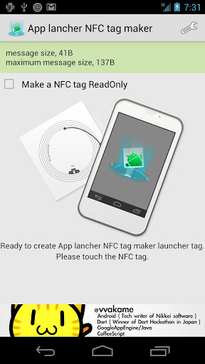 Let39;s advertise more effectively your app This app make the Application laucher NFC tag.How to promote your apps To enter the URL by hand? It is so painful. Read the QR code? To start the QR code reader is a pain. But, the Application Launcher tag can be scan only by induction to Play Market If the application is already installed if that app will start automatically.Seeing is believing Please try first If you will buy the NFC tag. Use this application to check required storage before. In general, NFC tag only has a very small storage.This application required android version over 4.0.3 . and Tag data read required Android version over 4.0 .