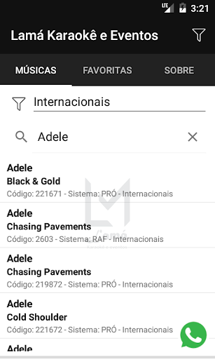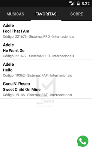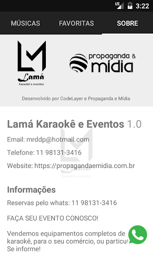 Baixe o nosso app Lamá Karaokê na Play Store, e tenha uma lista sempre atualizada das músicas que disponibilizamos em nossos eventos Karaokê, com a possibilidade de adicioná-las às suas favoritas. Fique de olho também em nossa agenda de eventos e dados para contato e orçamento.
