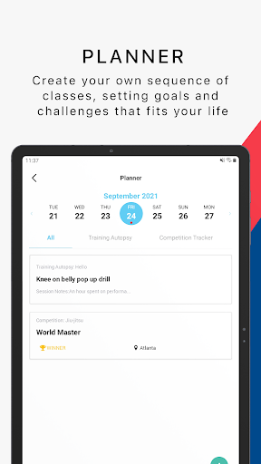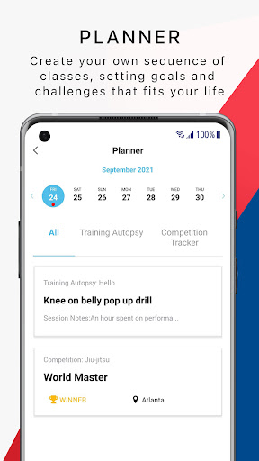 • The “Training Autopsy“ feature allows you to diessect your training and add useful notes that ensure you’re getting the most out of your training. What techniques did you learn today? What positions were giving you trouble in sparring? Set goals for yourself and record your progress.