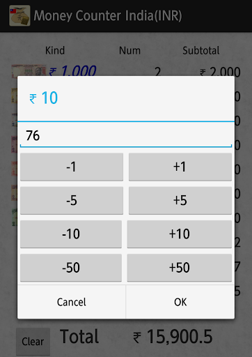 First of all, please press the kind of link of money that you want to record the number. Then, a special dialog where you can easily enter them in one hand a number will be displayed. Please press the OK button to enter the number. Then, the total amount will be calculated automatically.