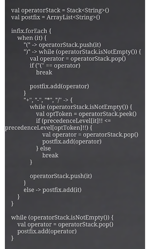 The calculator is implemented to calculate by converting the formula from the infix expression to the postfix expression.