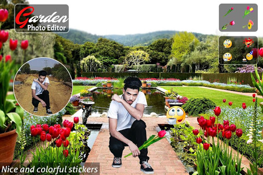 Garden Photo Editor App has a cut paste photo and set new Background and stickers in garden editing app.