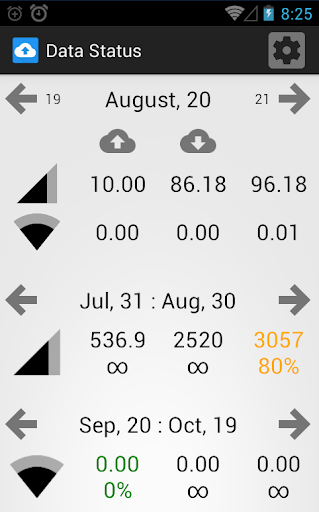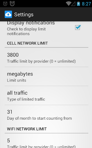 Data monitoring application for WiFi and cell network bandwidth. Application count traffic toward monthly quota with separate options for WiFi and cell connections.