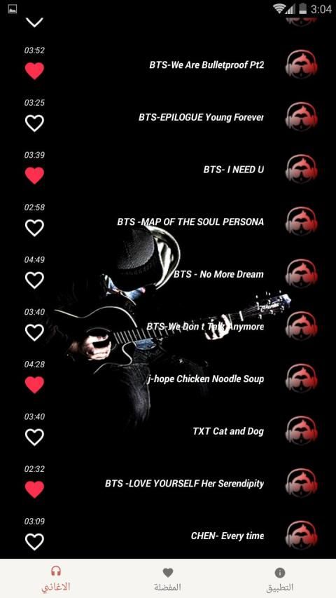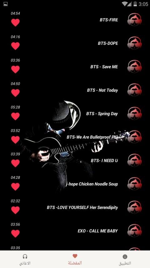 ايضا التطبيق يحتوي على قائمة للاغاني المفضلة التي تختارها انت ويمكن الاستماع الى الاغاني بشكل تلقائي واحده تلو الاخرى بالخلفية لمجموعة من الاغاني الكورية الرائعة والجميلة المنوعة التي يمكنك الاستماع لها والاستمتاع بها واستماعها في كل الاوقات دون الحاجة الى انترنت .